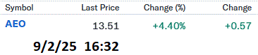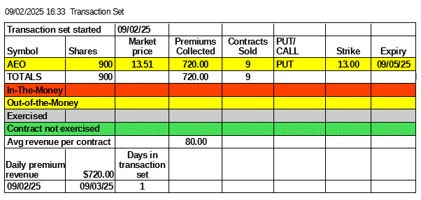 It would be nice if AEO stays above $13 dollar but there is no way of knowing if it will. I got a nice premium. If it closes on Friday above $13 then $720 would be 100% profit.