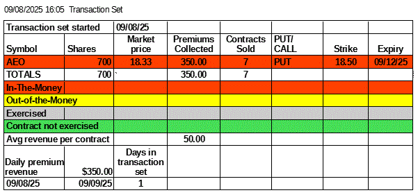 I sold 7 $18.50 PUT contracts that expire 9/12/25. Premium received: $350.00.